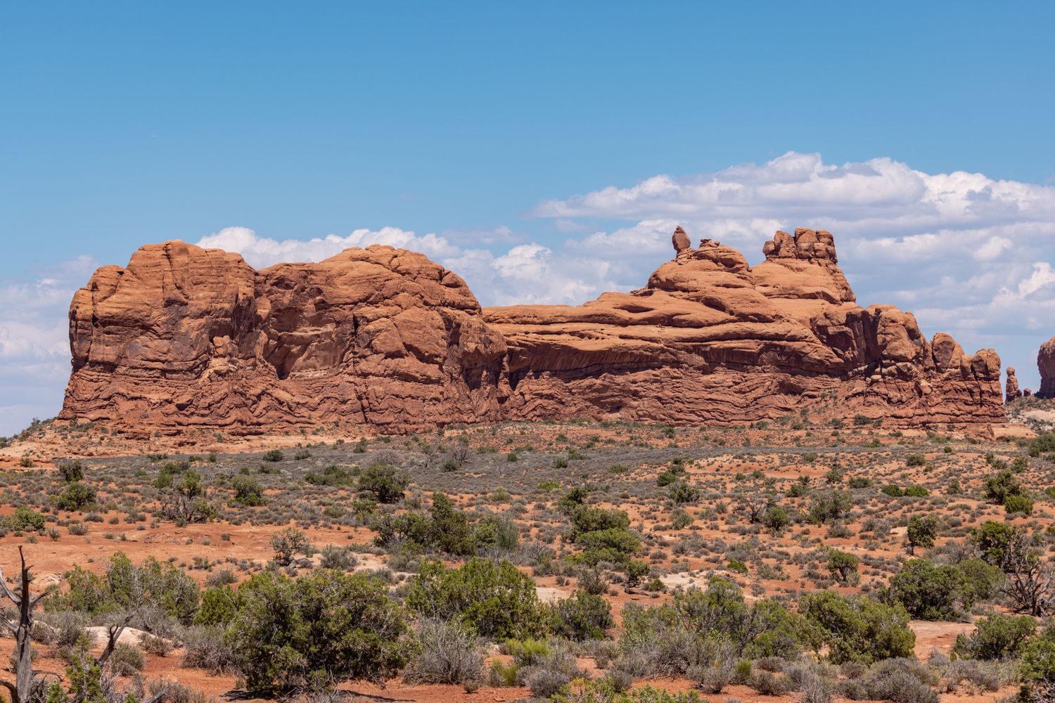 Arches National Park is known not only for its famous arches, but for the sandstone fins that create them — long vertical slabs that eventually weather into windows, spires, or free-standing towers. This formation represents that process mid-story, carved but not yet open, sculpted but still whole.