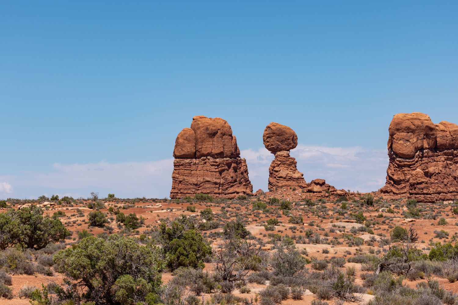 Balanced Rock is one of the most recognizable landmarks in Arches National Park. It stands at roughly 128 feet tall, with the upper boulder weighing an estimated 3,600 tons — all held in place by erosion-carved sandstone that will one day collapse as weathering continues. Like many features in Arches, it exists only temporarily on a geological timescale, carved by uplift, freeze-thaw cycles, and countless years of wind and water.