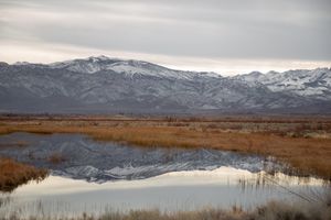 Round Mountain rests along the Owens Valley corridor, known for its seasonally heavy snow, smooth profile, and proximity to the larger Eastern Sierra skyline. Winter settles deep here, covering slopes long after the lowlands begin to warm, creating views just like this — white peaks, still water, and clean desert air.