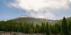 This print captures a deep green Colorado treeline backed by a rounded, barren peak just beginning to collect snow. The evergreens fill the foreground in rich texture, dark and full against the lighter tone of the mountain behind. Snow gathers softly along the upper slope — the first signs of winter settling into high elevation — while the rest of the peak remains exposed in warm earth and stone. The scene feels seasonal and quiet, a moment between fall and full winter where color and cold meet.