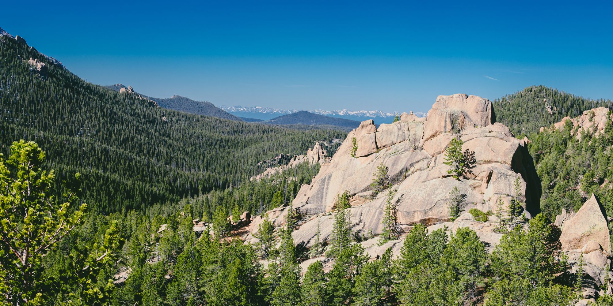 This print looks out from the rock formation left of The Crags — a broad overlook above a valley dense with green where Fourmile Creek winds below. The foreground stone drops off into open space, rough and warm in tone, while the valley spreads wide beneath it like a living carpet of pine. In the distance, Colorado’s mountains continue layer after layer, fading with elevation and atmosphere until they dissolve into horizon. The scene feels expansive, grounded, and entirely high-country — one view holding both scale and stillness.