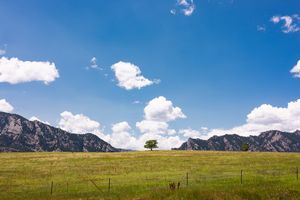Wide plains like this are a signature of the Colorado foothills, where grassland transitions toward the mountains and single trees often stand as the only interruption in the open landscape. The combination of blue sky, rolling hills, and framed peaks creates a natural balance that feels peaceful and uncluttered.