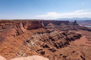 This print highlights the layered cliffs of Dead Horse State Park, captured at eye level so each stratum of rock is visible and distinct. The formation begins on the left side of the frame, weaving forward in terraces and textures until it meets the United Nations Tablet farther along the ridge. The layers stack in warm tones — red, orange, and sediment-washed neutrals — showing how the canyon was built piece by piece over unimaginable time. It’s a view that feels grounded and up close, emphasizing the structure of the land rather than the scale of the drop below.