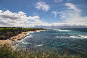 This print captures Ho‘okipa Beach on a clear Maui day, the ocean bright and blue beneath a sky full of wispy white clouds. The water rolls gently toward the shoreline, light reflecting in soft patterns across the surface. Even though the famous sea turtles aren't the focus here, their presence is felt in the calm, welcoming rhythm of the beach—a place where land, wind, and water move in harmony. The scene feels open, sunny, and distinctly Hawaiian, the kind of day where the island seems endless.