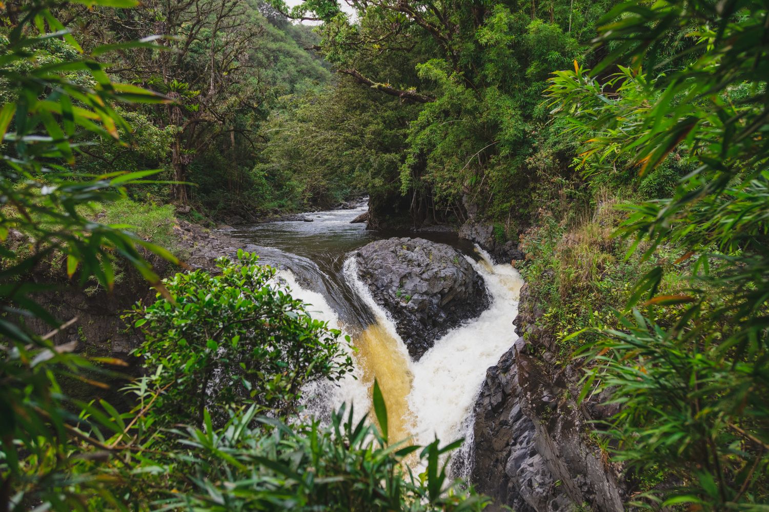 This print shows one of the smaller waterfalls along the Pīpīwai Trail — short and powerful, water thick with flow as it wraps itself around a single large rock at its center. It doesn’t fall in a thin ribbon or a tall drop. Instead, the water curves, splits, and gathers again, moving around the stone like the jungle carved it that way on purpose.